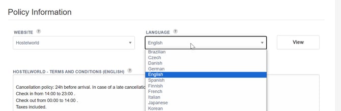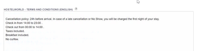 En el campo “Hostelworld – Términos y Condiciones”, puedes escribir o editar la política de cancelación y los Términos y Condiciones de tu propiedad en el idioma seleccionado.