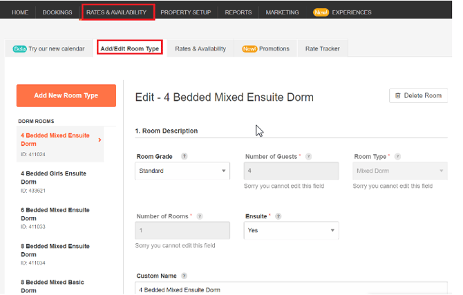 Questa guida ti mostra come creare, modificare e gestire i tipi di camera su Hostelworld Inbox.