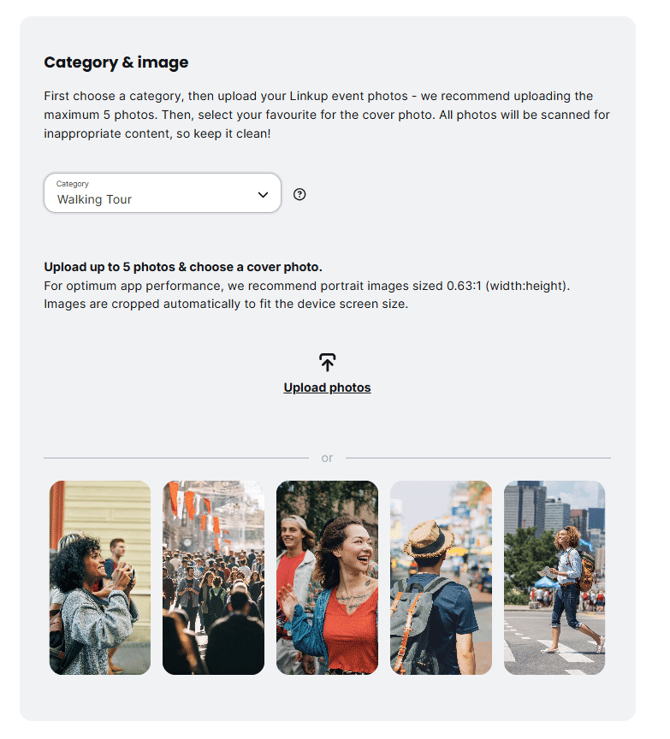 Select the category of the linkup like karaoke, yoga, tour, etc and the image.